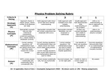 The rubric was designed to outline key components of physics problem solving and was titled generically Physics Problem Solving Rubric so students could use the established criteria to guide them on both homework and exam preparation. In addition, it gives students a guideline for homework grading and allows the opportunity for some students to self-grade and improve their home-work and problem outline technique. |